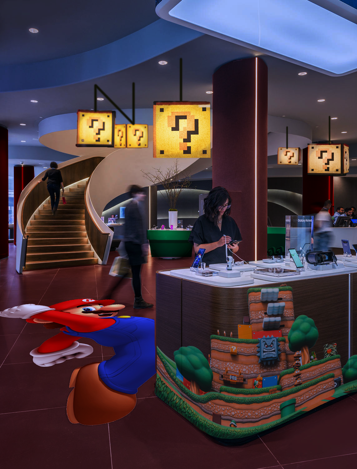 The project revolves around the brand promotion of Super Nintendo World in the Canadian market, focusing on creating a 100 square meter immersive Pop-Up experience store that allows viewers to interact with the charm of Mario World, while increasing brand awareness and market penetration. The goal is to increase brand exposure through offline Pop-Up stores and attract Nintendo fans, home users and tourists. The goal of the project was to design an immersive interactive space that combines digital interaction, AR experiences, and brand peripherals to give viewers an authentic feel for Mario's world.